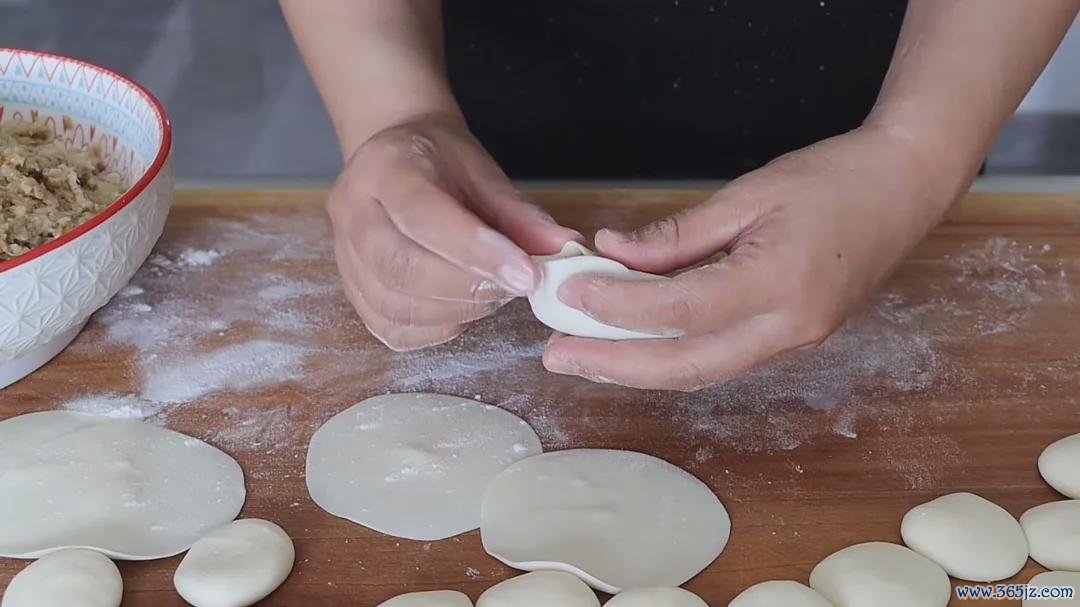 第5步,面团拿到案板上,不必揉,径直切成两条,再别离成细条,揪成大小均匀的面剂子,撒上一层干面粉滚一滚,严防相互粘连,再一一按扁,擀成薄薄的饺子皮,放上馅料,用民俗的手法包成饺子。
