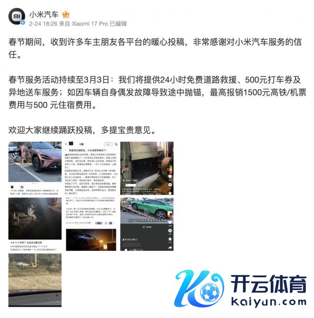 小米汽车推出"春节出行无忧"服务,除了不限次数、里程及拯救姿色的 24 小时免费谈路拯救外,还有"抛锚用度报销",用户可苦求含交通用度和住宿用度报销共计 2000 元的兜底额度,抚平"他乡抛锚"的错愕。