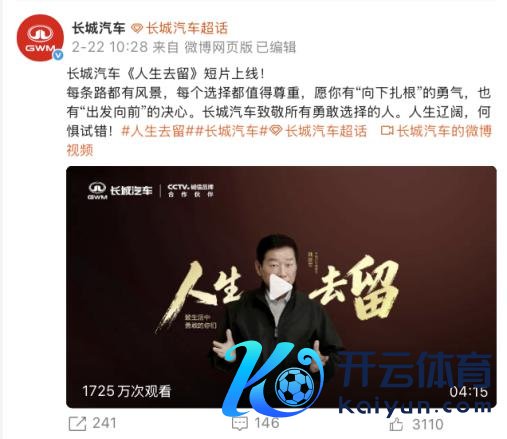 2 月 22 日,长城汽车发布温情短片《东谈主生去留》,全程无居品镜头,却精确刺中了现代年青东谈主最痛的抉择——"远处的梦想"已经"家乡的伴随"。这种"此时无车胜有车"的留白,让品牌不仅走在路上,更走进了年青东谈主的心里。