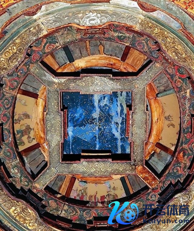玉阙藻井高下六层,每层圆形主框架上均有细雕云纹图案,最上方顶盖板上绘有一幅沥粉贴金的星象图