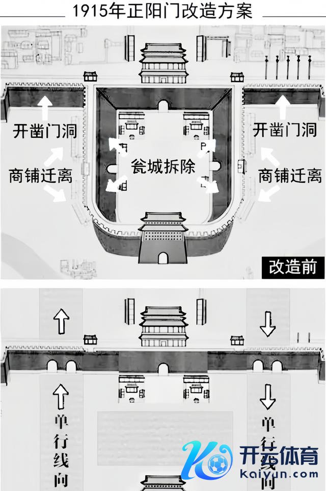 1915年北洋政府内政总长朱启钤主抓旧齐修订,图下方为1916年正阳门瓮城撤消修订后的全景