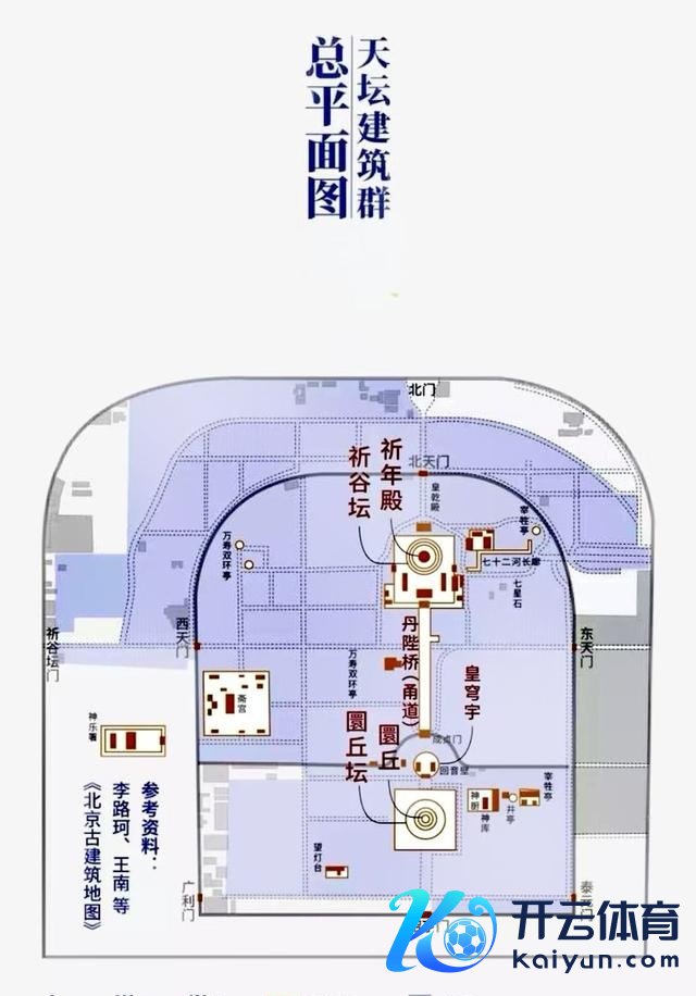 天坛总体分为内、外坛,合座呈“回”字形布局,主体建筑均散播于内坛的南北两头。南有圜丘坛、皇穹宇,北有祈谷坛的祈年殿、皇乾殿,西侧为斋宫,南北两坛之间由一条长360米、宽28米、高2米余的“丹陛桥”相鸠合,构成了一组磅礴完整、恢弘壮丽的建筑群。从平面俯视的角度,内坛位于外坛的南北中轴线以东,而圜丘坛和祈谷坛又位于内坛中轴线的东面,这么布局的目标为了增多西侧空间的空旷进度,使东谈主们从西边的正门干涉天坛后,即能获取极为轩敞的视线,从而感受到宇宙的开阔与自己的轻浅。
