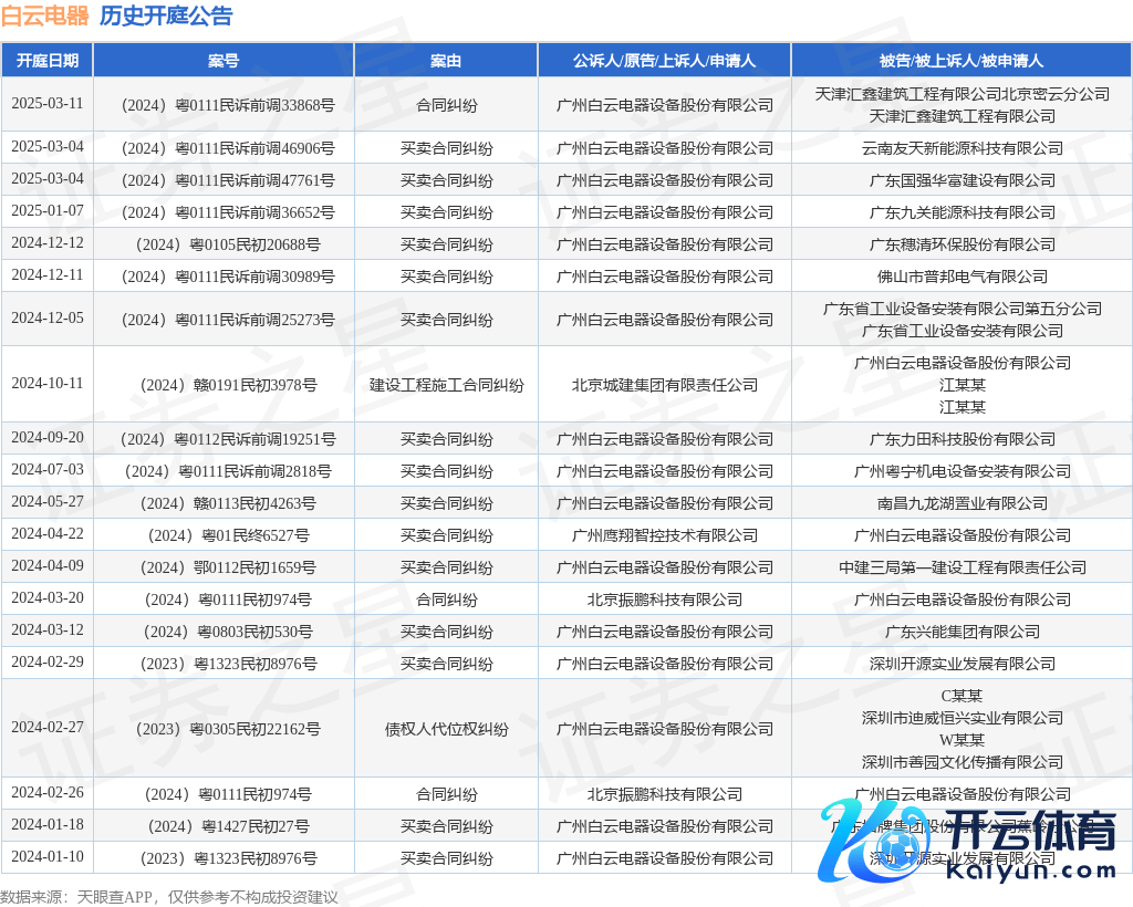 本站音问,证实天眼查APP浮现,近日公布了一则广州白云电器建树股份有限公司行为原告/上诉东说念主的开庭公告,详备践诺如下: