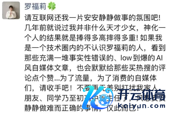 新浪科技讯 2月19日上昼音问,昨日晚间,前DeepSeek职工、被称为“95后AI天才仙女”的罗福莉发布一又友圈暗示,“请互联网还我一派安怡悦静作念事的氛围吧!几年前就说过我并非什么天才仙女,神化一个东说念主的后果便是捧得多高摔得多重!若是我是一个技能圈内的不料识罗福莉的东说念主体育游戏app平台,看到那些充满一堆事实性乖张的、low到爆的Al风自媒体著述,也会默然给那些买热搜的指摘点个赞...”