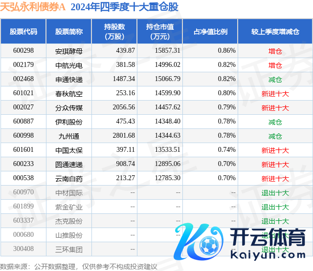 天弘永利债券A为债券型-夹杂二级基金,把柄最新一期基金季报知晓,该基金钞票树立:股票占净值比12.88%,债券占净值比107.32%,现款占净值比2.36%。基金十大重仓股如下: