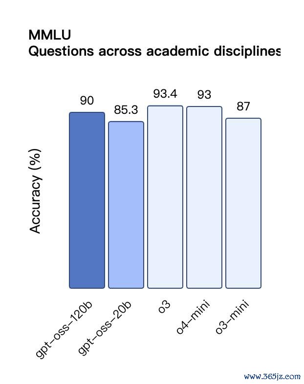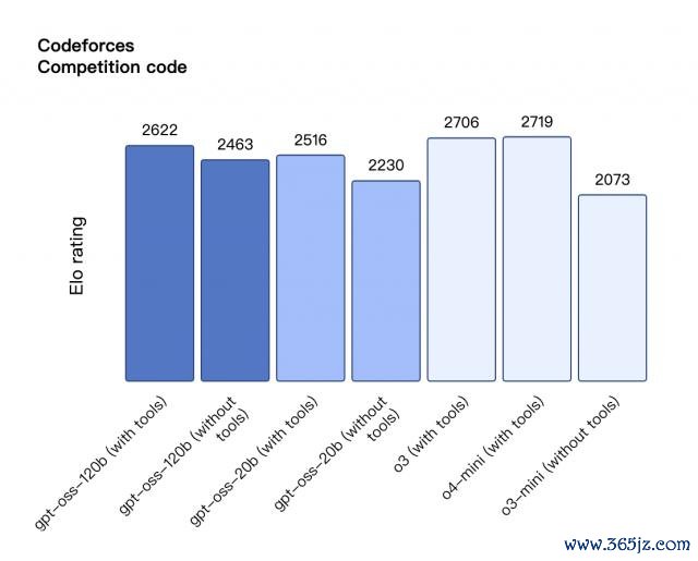 凭据 OpenAI 公布的基准测试拆伙,gpt-oss-120b 在竞赛编程的 Codeforces 测试中进展优于 o3-mini,与 o4-mini 持平;在通用问题责罚智商的 MMLU 和 HLE 测试中相似突出 o3-mini,接近 o4-mini 水平。