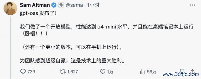 OpenAI CEO Sam Altman(山姆 · 奥特曼)在酬酢媒体上的愉快言外之音:「gpt-oss 发布了!咱们作念了一个绽开模子,性能达到 o4-mini 水平,何况能在高端条记本上运行。为团队感到超等骄横,这是期间上的要紧胜利。」