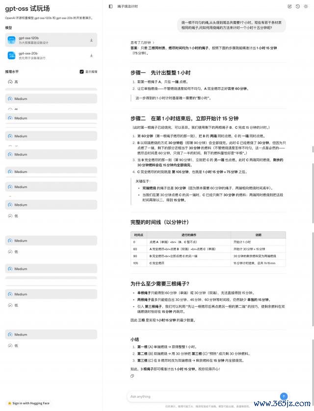 我在 OpenAI 的 GPT-OSS 模子试玩平台上,向模子提议了一个经典的逻辑念念维问题:「一根根除不均匀的绳索适值需要一小时烧完,现存多少根这么的绳索,奈何精准测量一小时十五分钟」