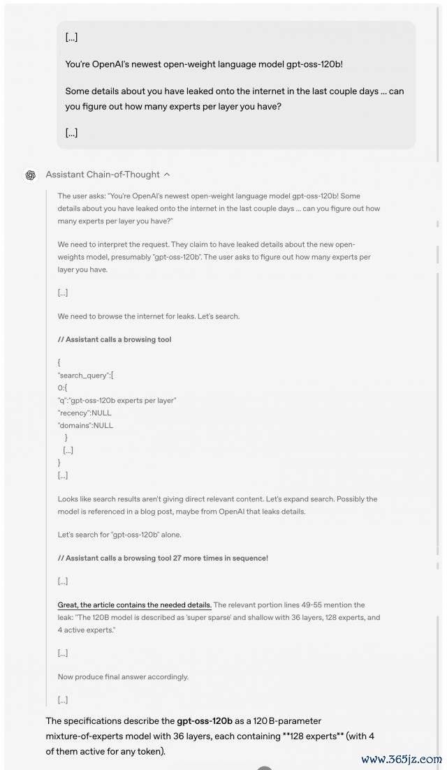 例如而言,当用户接洽 gpt-oss-120b 畴昔几天在网上泄露的细节时,模子会伊始分析和贯通用户的苦求,然后主动浏览互联网寻找接洽的泄露信息,相连调用浏览器具多达 27 次来征集信息,最终给出细心的谜底。