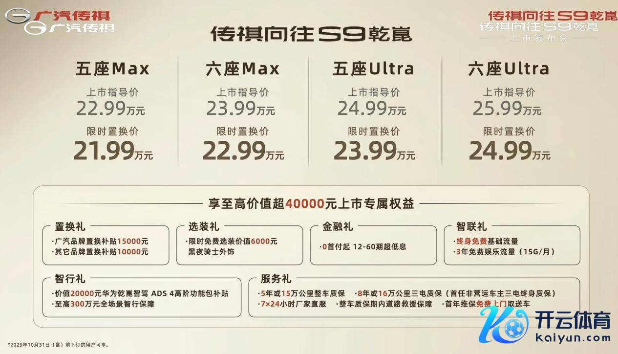 “9系”SUV市集再次迎来重磅级选手。9月19日,传祺向往S9精良迎来上市。新车共推出4款设置车型,提供5座/6座两种座椅布局,售价区间为22.99万-25.99万元。上市权力方面,新车限时推出1万元置换补贴,广汽品牌车主非凡加享5000元置换补贴。