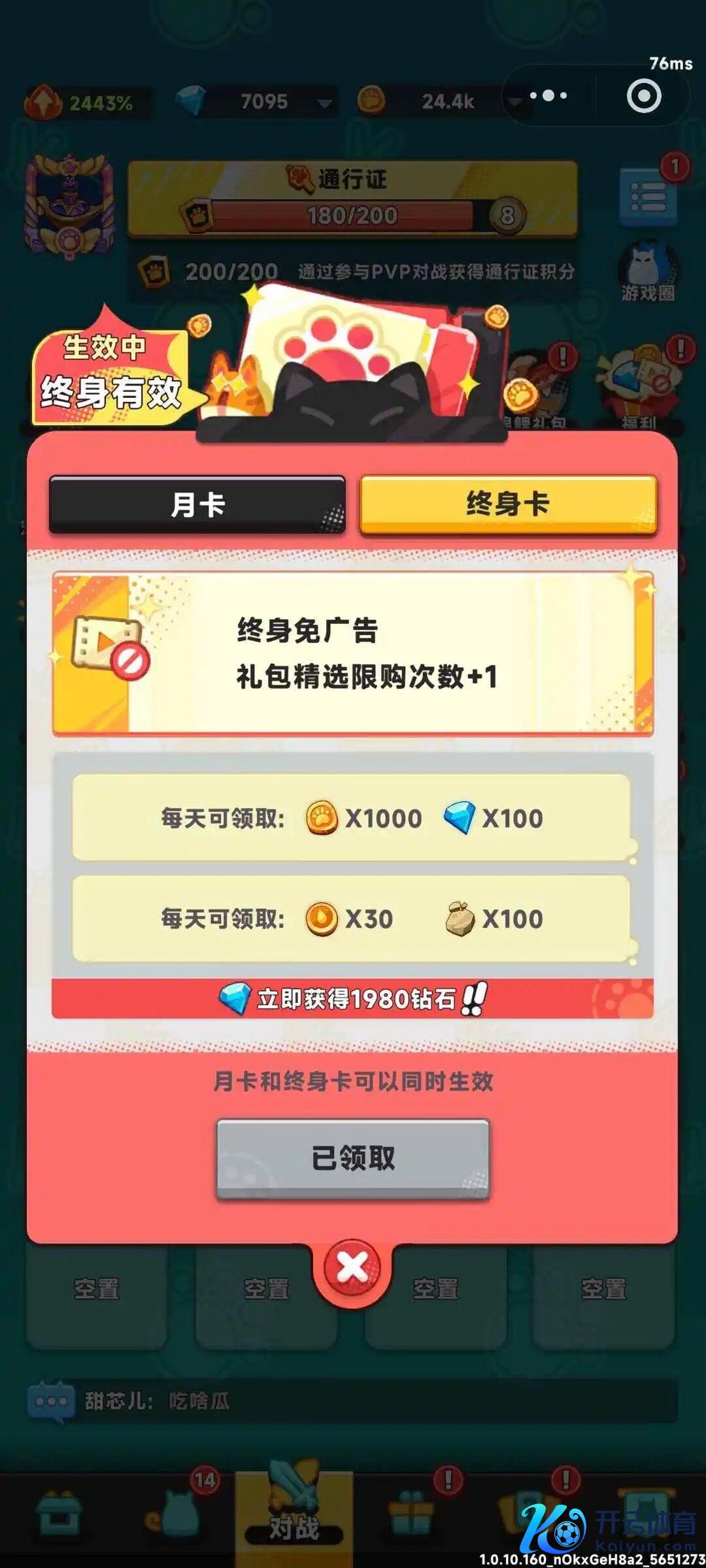 •毕生卡(约198元):相宜野心恒久玩的玩家,每天可领取100钻石和行运币,恒久陈述丰厚。