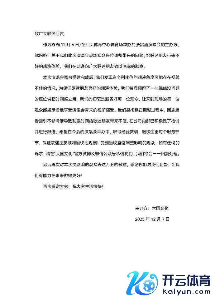 12月7日,张韶涵“觅光”天下巡回演唱会汕头站主理方广州大国文化发展有限公司@大国文化Musicnation-GZ就对于演唱会现场不雅众座位调治带来的问题发布谈歉信。