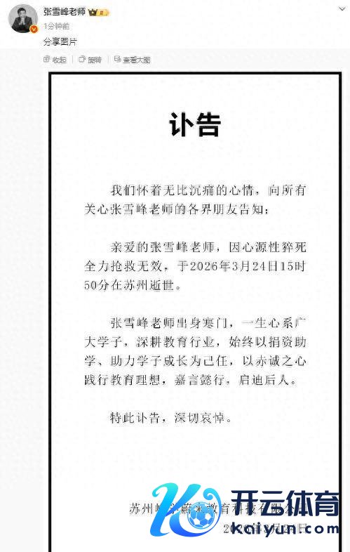 3月24日晚间,“张雪峰老诚”外交账号发布讣告,讣告涌现,张雪峰因心源性暴毙全力抢救无效,于2026年3月24日15时50分在苏州祛除。